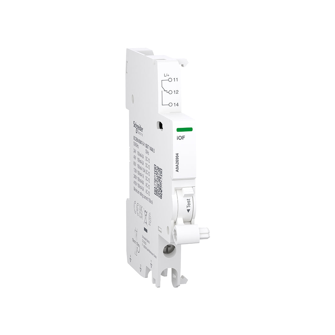Auxiliary contact, Acti9 A9A, iOF, 1 C/O, 100mA to 6A, 24VAC to 415VAC, 24-130 VDC, bottom connection