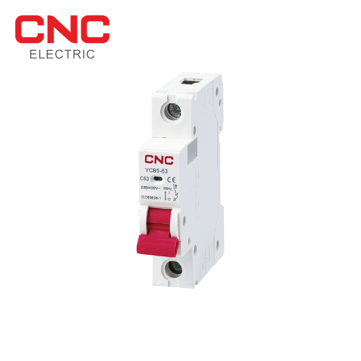 The YCB9-63 by CNC Electric is a miniature circuit breaker (MCB) designed for overload and short-circuit protection in residential, commercial, and industrial applications. It operates at 230/400V AC with rated currents ranging from 1A to 63A and offers configurations of 1P, 2P, 3P, or 4P. With breaking capacities of 4.5kA or 6kA, it supports Type B, C, and D tripping curves to suit various needs. Built for durability, it has a mechanical life of 20,000 operations and electrical life of 8,000. The MCB is easy to install on DIN rails, features IP20 protection, and operates in temperatures from -5ÁC to +40ÁC, ensuring reliable performance in diverse environments.