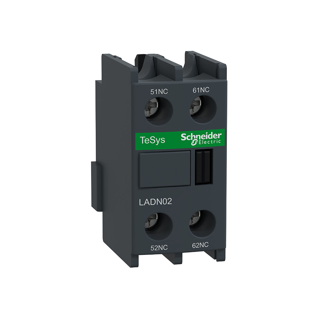 TeSys Deca instantaneous auxiliary contact block, for contactors LC1D, LC1F and control relays CAD. It provides 2NC contacts (NC mirror certified) rated up to 10A/690V AC, connection by screw clamp terminals. Clip-on front mounting, it procures high reliability and durability. Multi standards certified (IEC, UL, CSA, CCC, EAC), Green Premium compliant (RoHS/REACh).