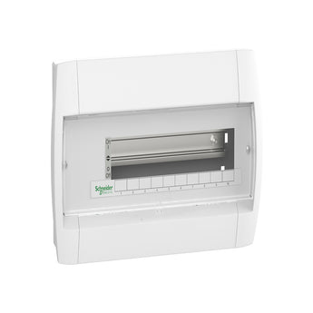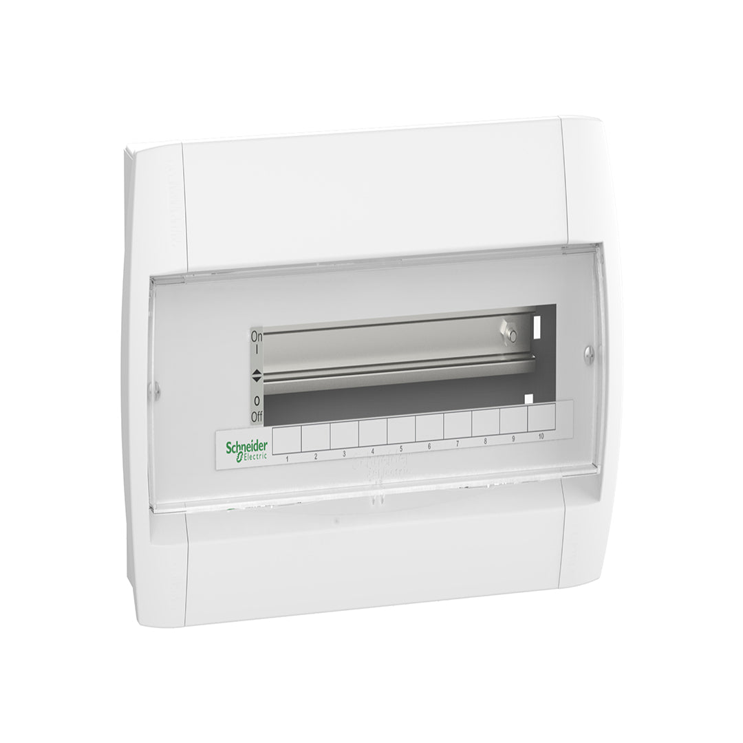 This Acti9 Disbo product is suitable for flush and surface mounting, Single phase distribution board. The rated current can be up to 100A.The number of ways is 10 and 1 Row. enclosure, DIN rail, earthing bar & Neutral bar are provided. The dimensions are (W) 315mm x (H) 73mm x (D) 208mm. The color of the consumer unit is white (RAL9003).The enclosure material is made of electro galvanised steel. The degree of protection is IP40 conforming to IEC 60529. This enclosure is Compliant with IEC 61439-3 standards.