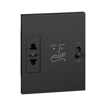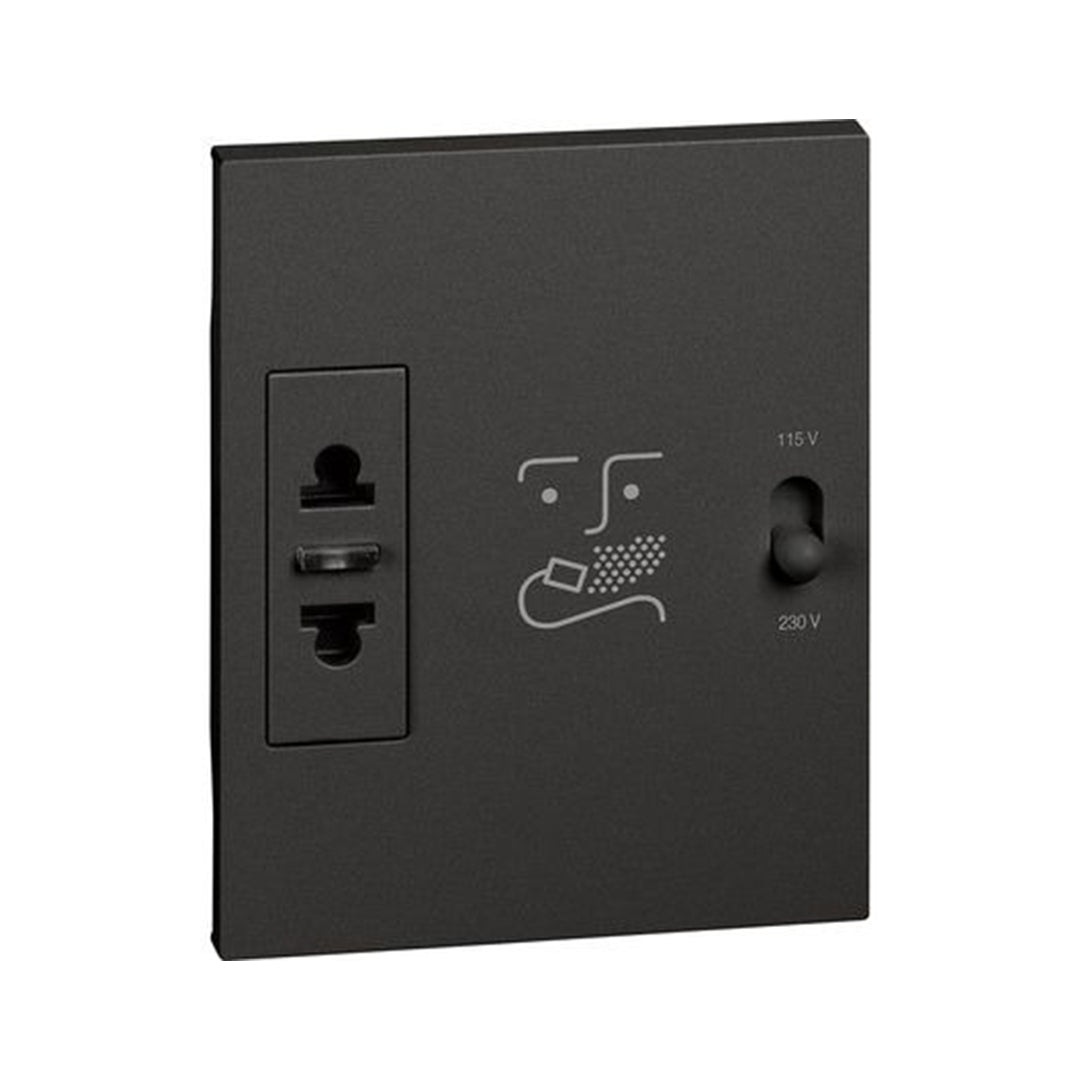 Shaver socket with insulation transformer - input voltage 230 Va.c. 50/60 Hz - output voltage 115/230 Va.c. 20 VA. The cover of the selected colour is supplied in the same box as the shaver socket - 3 modules - black