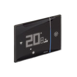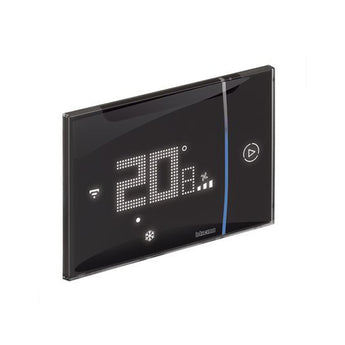 The Smarther AC with Netatmo connected thermostat, together with the Home + Control APP, is a device which allows to precisely and accurately adjust and monitor the temperature in the rooms; all the programming and most of the functions can be easily and intuitively performed using the App. Thanks to its Wi-Fi connection, Smarther AC can be programmed and controlled remotely; it can also display the temperature, fan speed and humidity measured in the room. The temperature level can be set locally for manual operation and Boost mode can be activated. The Boost forces the switching on of the system for a limited time (15, 30 or 45 minutes) irrespective of the measured and programmed temperature. Smarther AC with Netatmo can also be controlled with Google, Amazon Alexa and Apple Home Kit voice assistants. Main features: - Power supply 110 to 240 Vac , 50/60 Hz; - 2 W max absorption; - Maximum cable section 1 x 1.5 mm2; - Operating temperature 5 to 40 ÁC; - 1-switching contact output free of 5(2)A potential. - Type of operation 1BU - Pollution index 2 - Rated pulse voltage 4 kV - Wireless device in compliance with 802.11b/g/n standard, frequency 2.4 - 2.4835 GHz, transmission power < 20 dBm. WEP/WPA/WPA2 safety protocol IPv4. - Radio link: short range communication, frequency 868MHz/915MHz, transmission power < 25mW e.r.p. Types of installation: - flush mounted, on boxes item 503E or 500 (for item 500 use the wall dowels) - plasterboard, on boxes item PB503 and PB502. Black colour.