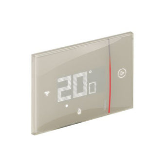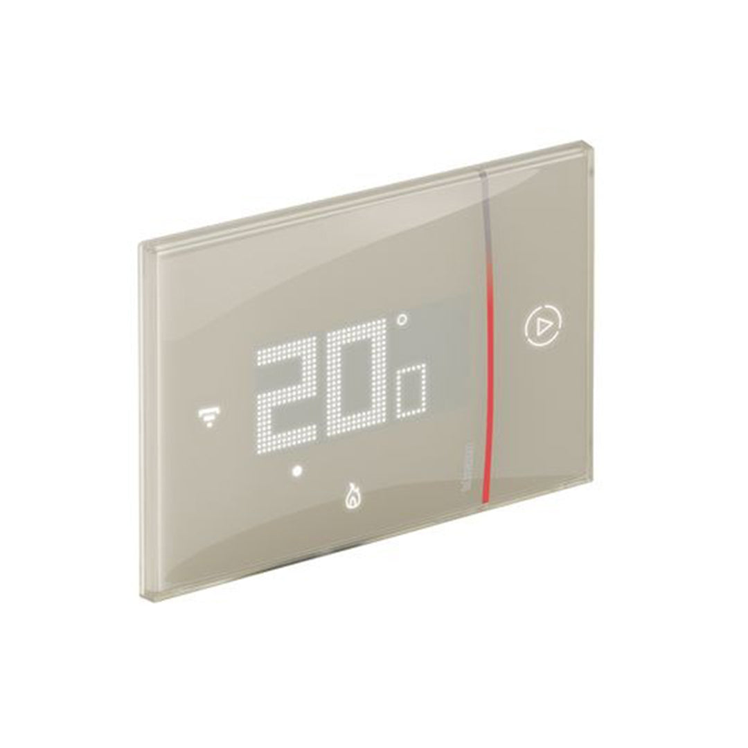 Smarther with Netatmo connected thermostat - sand finish. Together with the dedicated HOME+CONTROL APP, it allows you to adjust and monitor the temperature in the rooms precisely and accurately; all the programming and most of the functions are performed simply and intuitively using the APP. Thanks to its Wi-Fi connection, Smarther with Netatmo can be programmed and controlled remotely; it can also display the temperature and humidity measured in the room. The temperature level can be set locally for manual operation and the Boost mode can be activated. The Boost forces the switching on of the system for a limited time (30, 60 or 90 minutes) independent of the measured and programmed temperature. It's also possible to set a different temperature in each room of the house for the maximum comfort, thanks to its compatibility with Netatmo's intelligent thermostatic valves. Smarther with Netatmo can also be controlled with Google, Amazon Alexa and Apple Home Kit voice assistants.