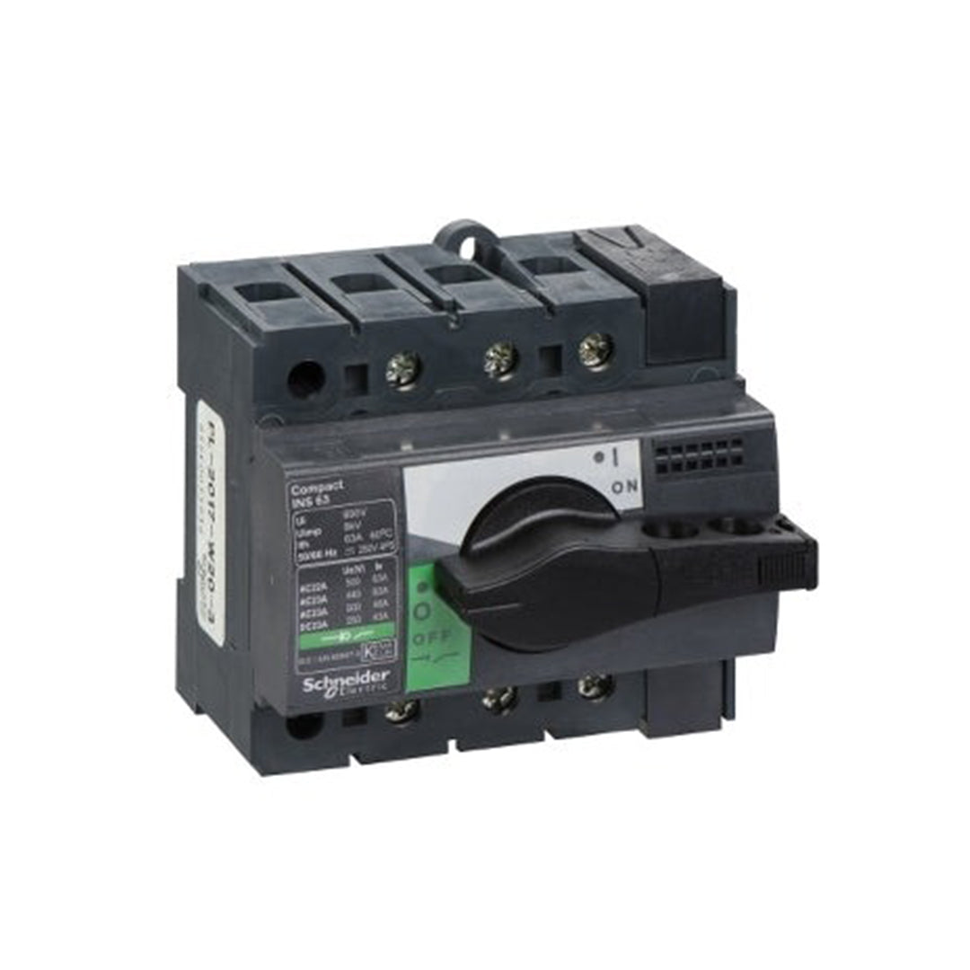 This Compact INS63 is a 3 poles non-automatic switch-disconnector with black rotary handle. It is suitable for isolation with positive contact indication, as defined by IEC 60947-1 and IEC60947-3 standards. The operational current is 63A at 415VAC in categories AC22A and AC23A. The rated voltage is 500VAC 50/60Hz or 250VDC. The black rotary handle is designed to offer easy operation and high performance in interruption of currents. Compact INS63 is a class II insulation level front-face device as per IEC 60664 standard.