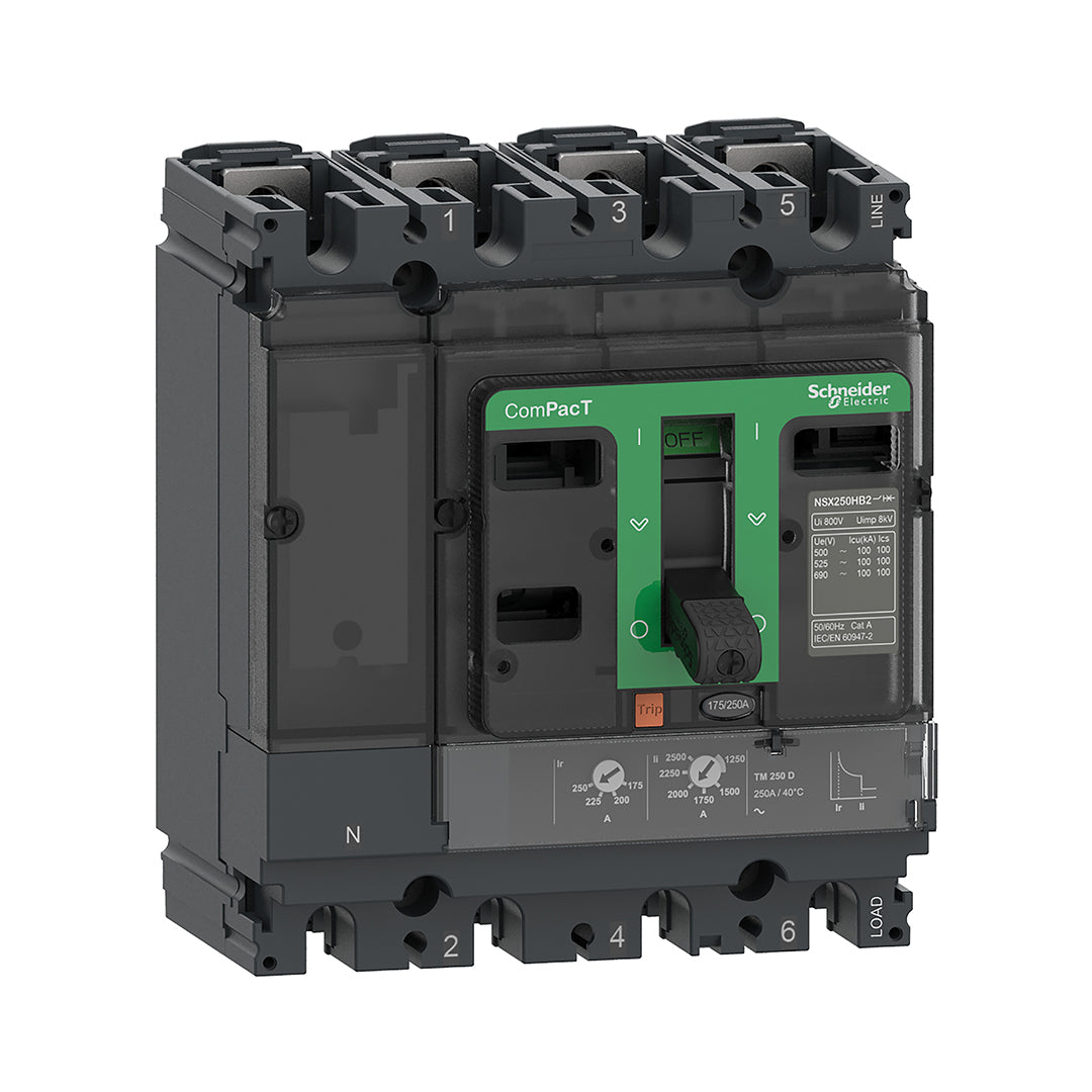 This ComPacT NSX160F is a complete 4P 4d fixed circuit breaker designed to optimize space and breaking capacity. It is an optimal choice for all standard and specific applications. The breaking capacity (Icu) is 36kA rms at 415VAC 50/60Hz. The operational voltage is 690VAC 50/60Hz. This product embeds a 160A rating thermal-magnetic trip unit (TMD). TMD trip unit provides an adjustable thermal overload protection and a fixed magnetic protection. This 4 poles version (140mm x 161mm x 86mm) comes with a variety of optional functions and accessories. It is compliant with international standards (IEC 60947), CCC, EAC and marine specifications. ComPacT NSX160F is part of Schneider Electric EcoStruxure Power architecture.