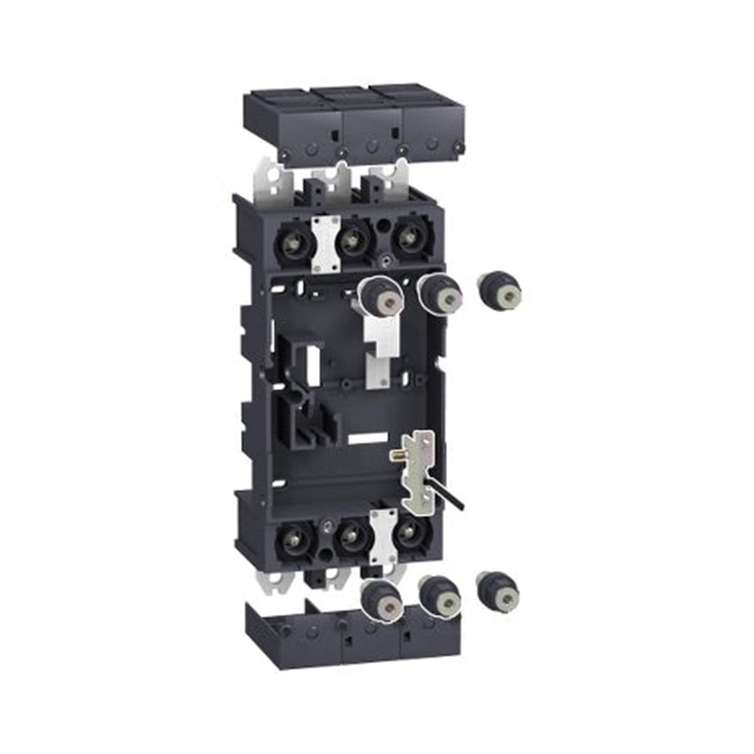 This is a plug-in kit for 3 poles Compact NSX 400/630 fixed circuit breakers. A plug-in configuration is made by adding a plug-in kit to a fixed Compact NSX device. This kit includes a plug-in base (LV432516), 3 power connections (LV432518), 2 short terminal shields (LV432591) and a safety trip interlock (LV432520). A plug-in configuration allows to install or extract rapidly and easily the circuit breaker from its base. This operation can be done without connecting or disconnecting the power circuit.