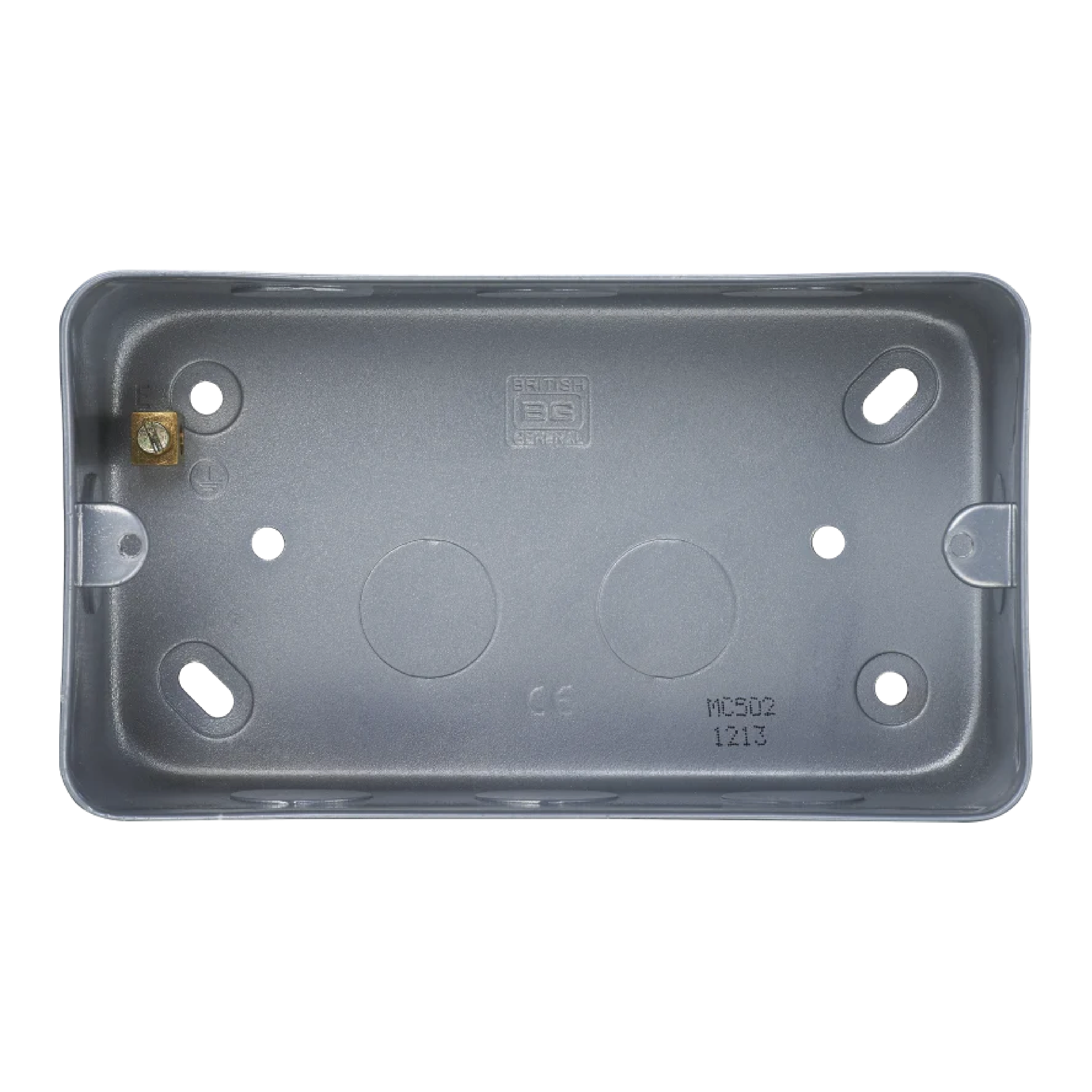 This double surface mounting box from British General is ideal for installing power points without the need to remove material from the wall. This box has multiple knockouts for versatility and an earth terminal fitted as standard. Made from a rugged scratch resistant steel for everyday use in commercial environments, and ideal for use with accessories from the BG Metal Clad and Grid range.