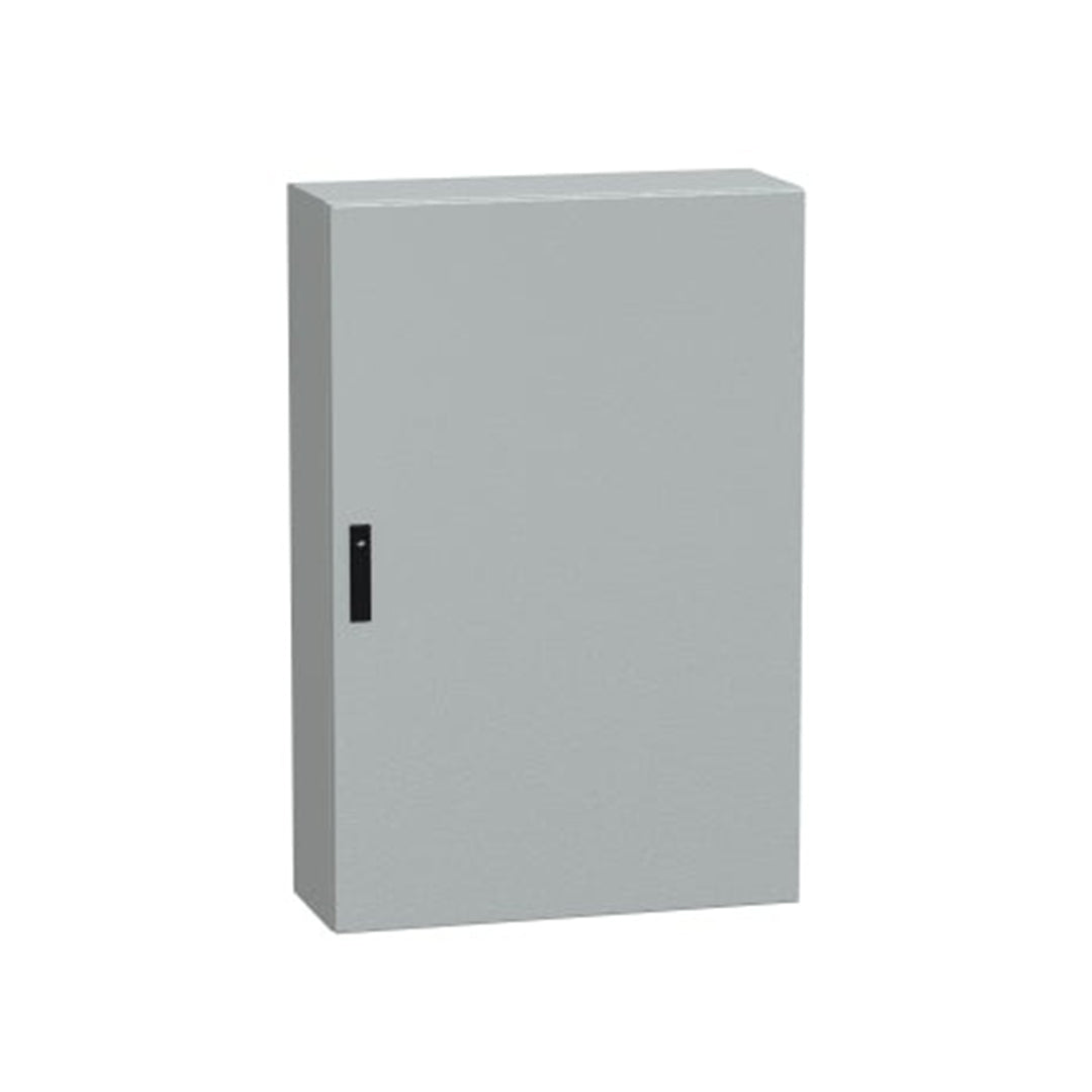 Spacial CRN wall mounted steel enclosure with plain door. 1200 x 800 x 300 mm. Compact enclosure wall mounting without mounting plate. Reversible (120ç) glazed door type. Sides made from a single folded section. Back welded with double profile forming a protected sealed area. 3 mm double-bar lock. Body and door made in steel with security glass. Surface finish in epoxy polyester powder. Grey (RAL 7035). Degree of protection IP66 and IK08.