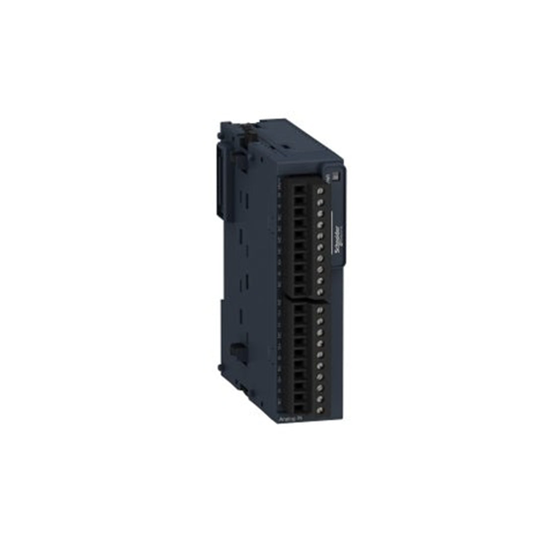 This product is part of the Modicon TM3 range, an offer of expansion I/O modules for Modicon M221, M241, M251 and M262. The analogue input module provides 4 inputs with 12bit + sign and 11bit resolution. It is an input module with a rated supply voltage of 24V DC and a current consumption of 35mA at 5V DC via bus connector no load, 45mA at 5V DC via bus connector full load, 30mA at 24V DC via external supply. This product is capable of controlling variable speed drives or any device equipped with a current or voltage input. There is an insulation between input and supply at 1500V AC, input and internal logic at 500V AC. It is furnished with removable screw terminal for electrical connection with 3.18mm pitch adjustment for inputs and supply. It is an IP20 rated product. Its dimensions are 23.6mm (Width) x 70mm (Depth) x 90mm (Height). It weighs 0.11kg. This product is certified by CE. It meets EN/IEC 61131-2 and EN/IEC 61010-2-201 standards. This module is compatible with Modicon M262, Modicon M241, Modicon M251 and Modicon M221 logic controller. It supports top hat type TH35-15, top hat type TH35-7.5 rail conforming to IEC 60715 and plate or panel with fixing kit mount. Modicon TM3 expansion modules have been designed with a simple interlocking assembly mechanism. A bus expansion connector is used to distribute data and the power supply when assembling the Modicon TM3 modules with logic controllers. Boost the performance of your controller with the Modicon TM3 I/O system specially designed for the Modicon M221, M241 and M251 logic controllers.