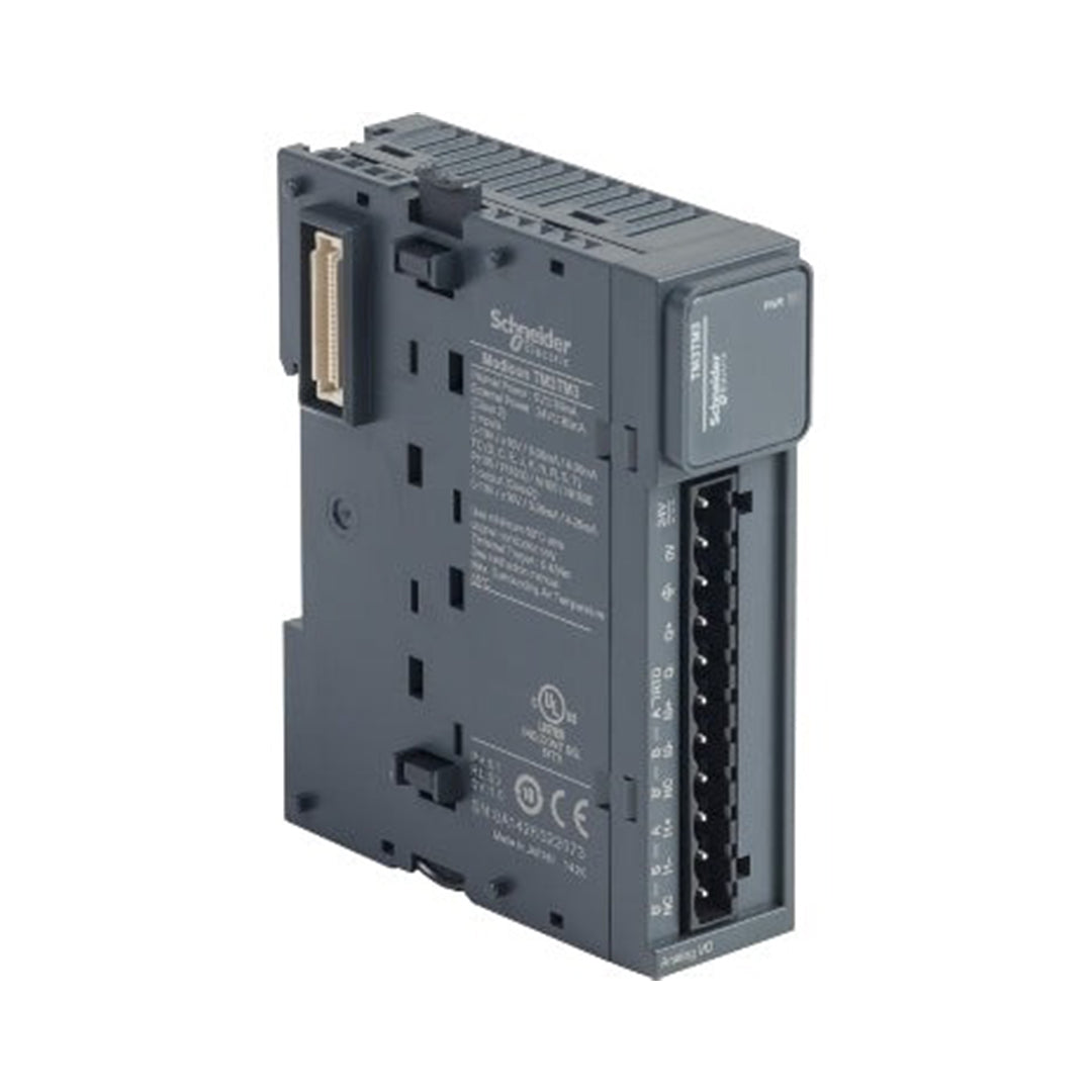 This product is part of the Modicon TM3 range, an offer of expansion I/O modules for Modicon M221, M241, M251 and M262. The analogue I/O module provides 2 inputs, 1 output with 16bit, 15bit + sign input resolution. It is an I/O module with a rated supply voltage of 24V DC, a current consumption of 60mA, 55mA at 5V DC via bus connector, 55mA, 80mA at 24V DC via external supply. This product is capable of controlling variable speed drives or any device equipped with a current or voltage input. There is an insulation between input and supply at 1500V AC, input and internal logic at 500V AC, output and supply at 1500V AC and output and internal logic at 500V AC. It is furnished with removable screw terminal for electrical connection with 5.08mm pitch adjustment for inputs, outputs and supply. It is an IP20 rated product. Its dimensions are 23.6mm (Width) x 70mm (Depth) x 90mm (Height). It weighs 0.115kg. This product is certified by CE. It meets EN/IEC 61131-2 and EN/IEC 61010-2-201 standards. This module is compatible with Modicon M262, Modicon M241, Modicon M251 and Modicon M221 logic controller. It supports top hat type TH35-15, top hat type TH35-7.5 rail conforming to IEC 60715 and plate or panel with fixing kit mount. Modicon TM3 expansion modules have been designed with a simple interlocking assembly mechanism. A bus expansion connector is used to distribute data and the power supply when assembling the Modicon TM3 modules with logic controllers. Boost the performance of your controller with the Modicon TM3 I/O system specially designed for the Modicon M221, M241 and M251 logic controllers.
