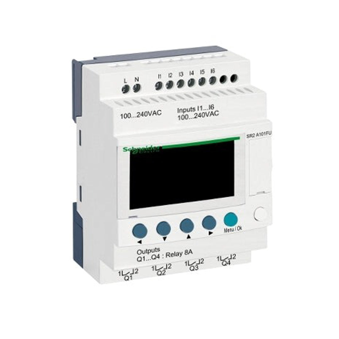 This Zelio Logic SR2 compact smart relay / programmable controller uses a supply voltage of 100V to 240V alternating current. It has 10 inputs / outputs with screw-clamp terminals and has an integrated LCD display. It has compact design, allowing installation on DIN rail. It also offers simple programming, display and diagnosing of malfunctions display and navigation buttons. Its simple ladder programming makes it adapted for non-specialists.