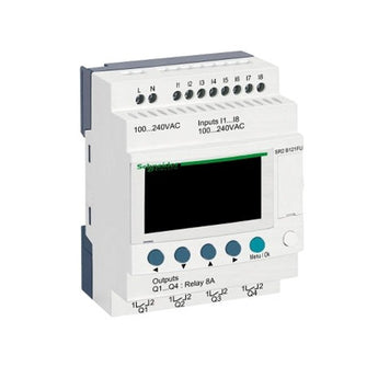 This Zelio Logic SR2 compact smart relay / programmable controller uses a supply voltage of 100V to 240V alternating current. It has 12 inputs / outputs with screw-clamp terminals, has an integrated clock and LCD display. It has compact design, allowing installation on DIN rail. It also offers simple programming, display and diagnosing of malfunctions display and navigation buttons. Its simple ladder programming makes it adapted for non-specialists.