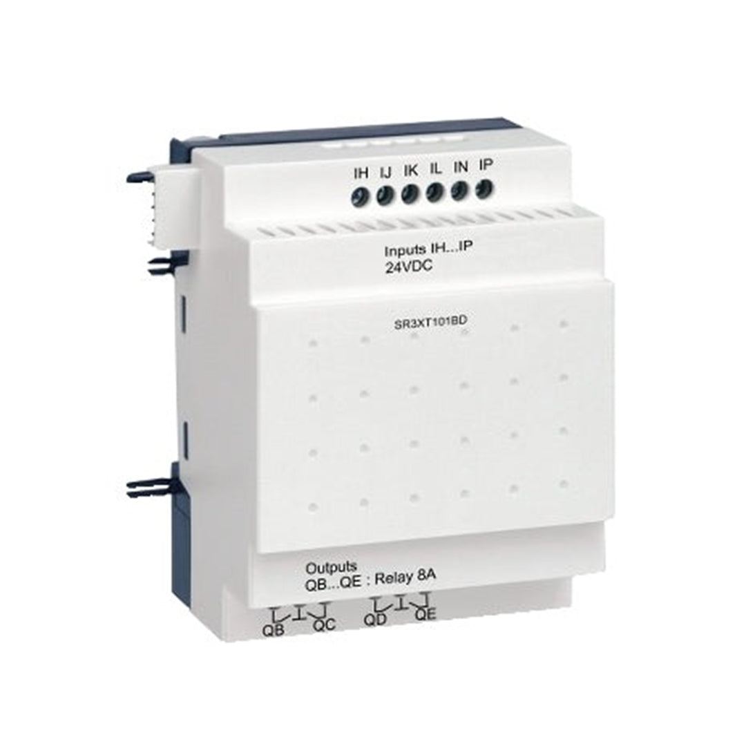This Zelio Logic SR3 discrete I/O extension module smart relays uses a supply voltage of 24V direct current. It has 10 inputs / outputs contact with screw-clamp terminals. It enables simple ladder programming, adapted for non-specialists.