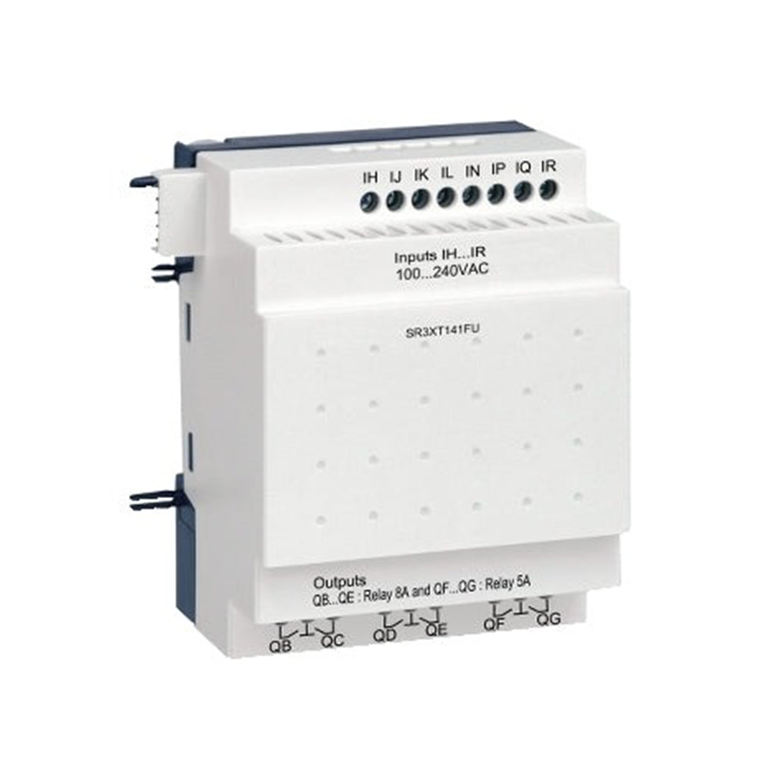 This Zelio Logic SR3 discrete I/O extension module smart relays uses a supply voltage of 100V-240V alternating current. It has 14 inputs / outputs contact with screw-clamp terminals. It enables simple ladder programming, adapted for non-specialists.