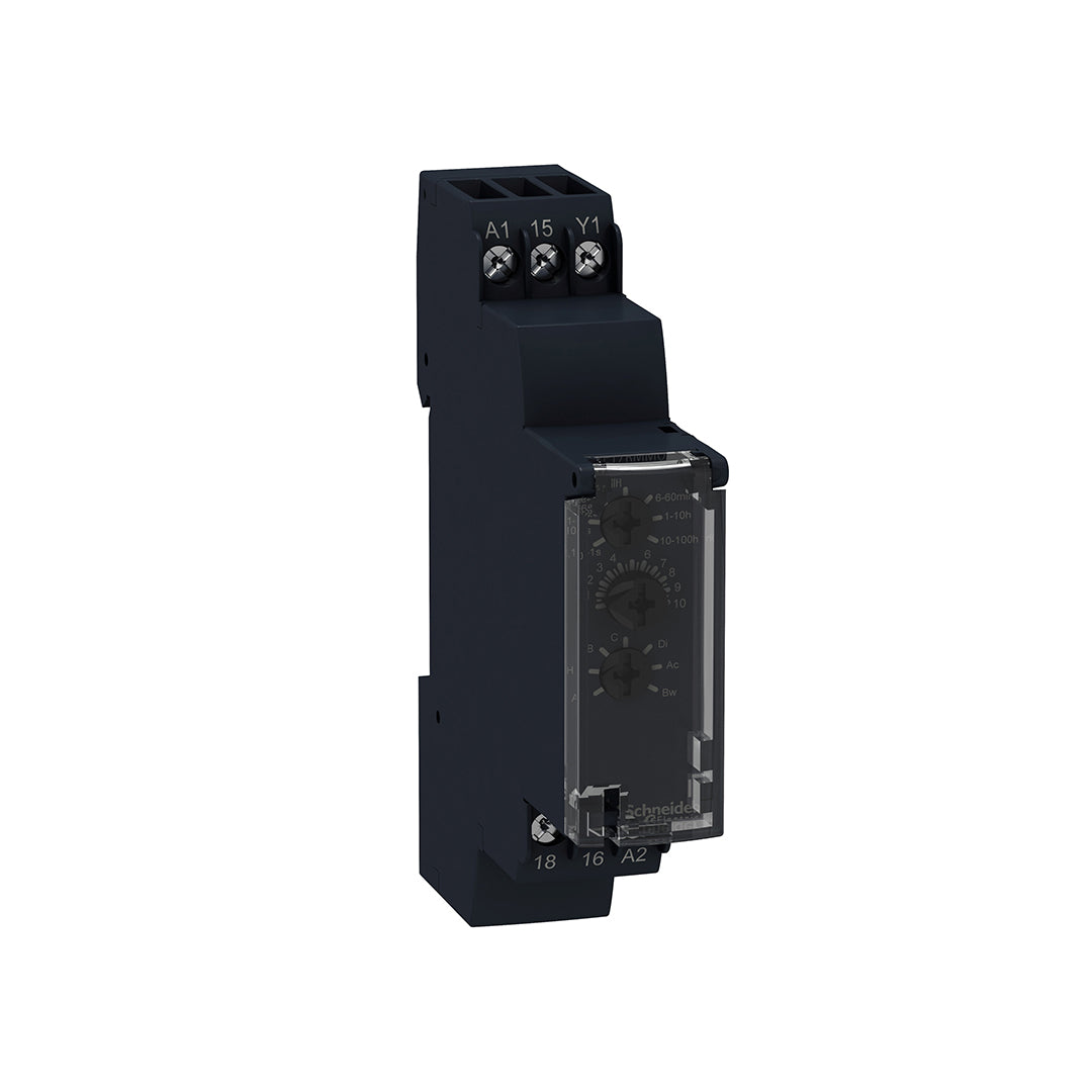 This Harmony RE17R timing relay can be set between 0.1 seconds and 100 hours, has an output rating of 8A, is 17.5mm wide and can be supplied with 24V DC, 24V to 240V AC. It also has 1 changeover contact SPDT (single pole double throw). It has one of market slimmest form-factors, allowing for a flexible and easy installation on DIN rail, using the same space as any modular 1-pole DIN device. It also offers a sealable cover, simple and precise settings with rotary trimmers. Multi function timer for a simple integration in hard-wired logic schematics, ideal for refurbishment of old installations without using a PLC.
