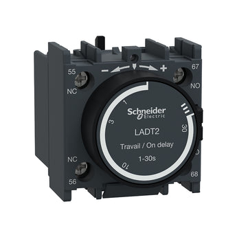TeSys Deca time delay auxiliary contact block, for contactors LC1D, LC1F and control relays CAD. It provides 1NO+1NC contacts rated up to 10A 690V AC, On-delay setting range 1-30s, connection by screw clamp terminals. Clip-on front mounting, it procures high reliability and durability. Multi standards certified (IEC, UL, CSA, CCC, EAC), Green Premium compliant (RoHs/Reach).