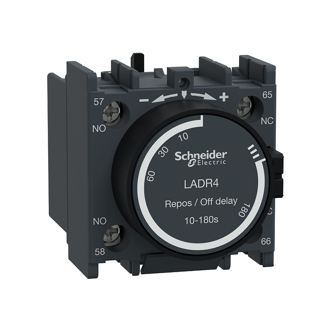 TeSys Deca time delay auxiliary contact block, for contactors LC1D, LC1F and control relays CAD. It provides 1NO+1NC contacts rated up to 10A 690V AC, Off-delay setting range 10-180s, connection by screw clamp terminals. Clip-on front mounting, it procures high reliability and durability. Multi standards certified (IEC, UL, CSA, CCC, EAC), Green Premium compliant (RoHs/Reach).