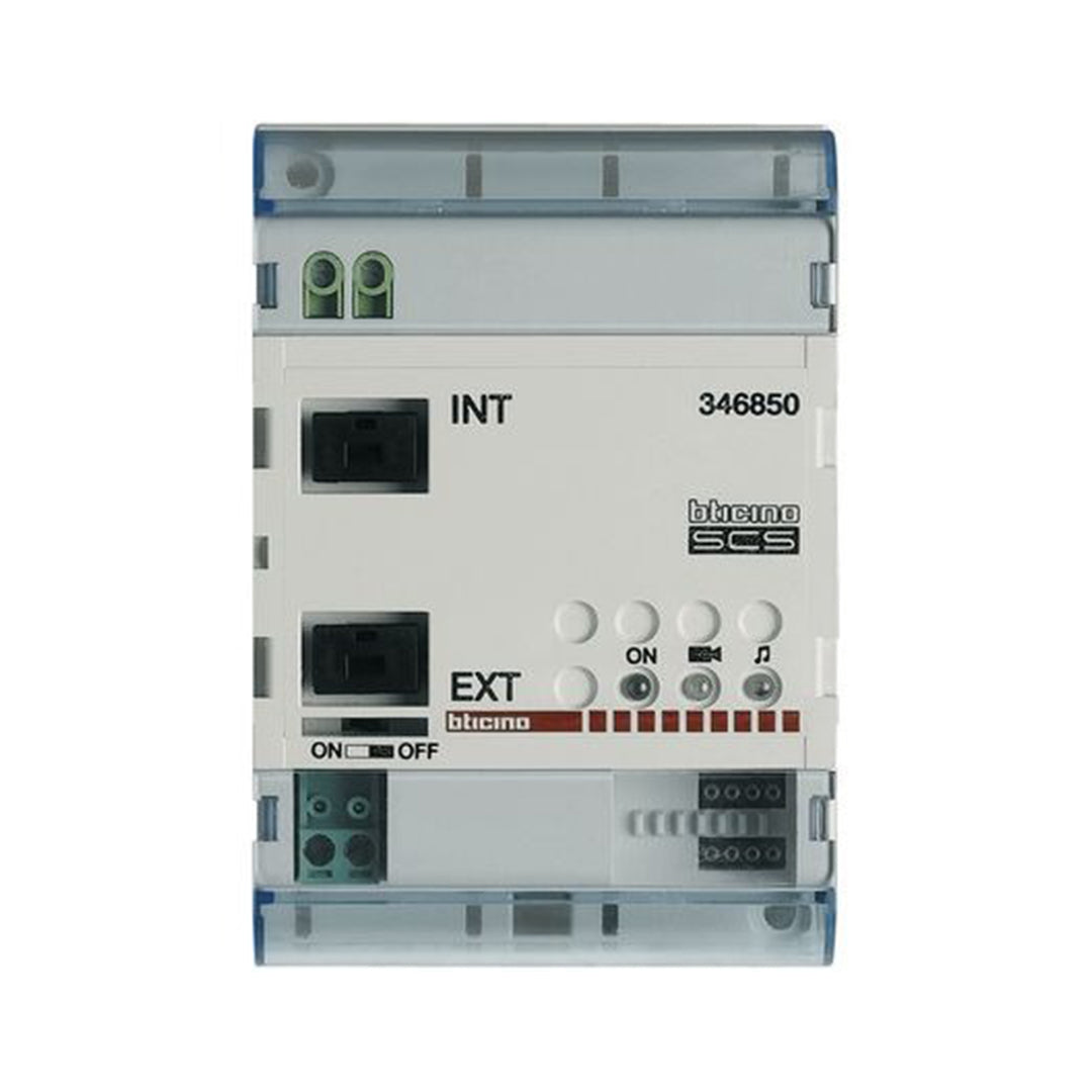 Apartment interface in 4 DIN modular enclosure. Can interface a dedicated apartment video door system with local CCTV, sound system and control of the Home automation applications to a 2-WIRES riser. The device must be configured using physical configurators
