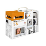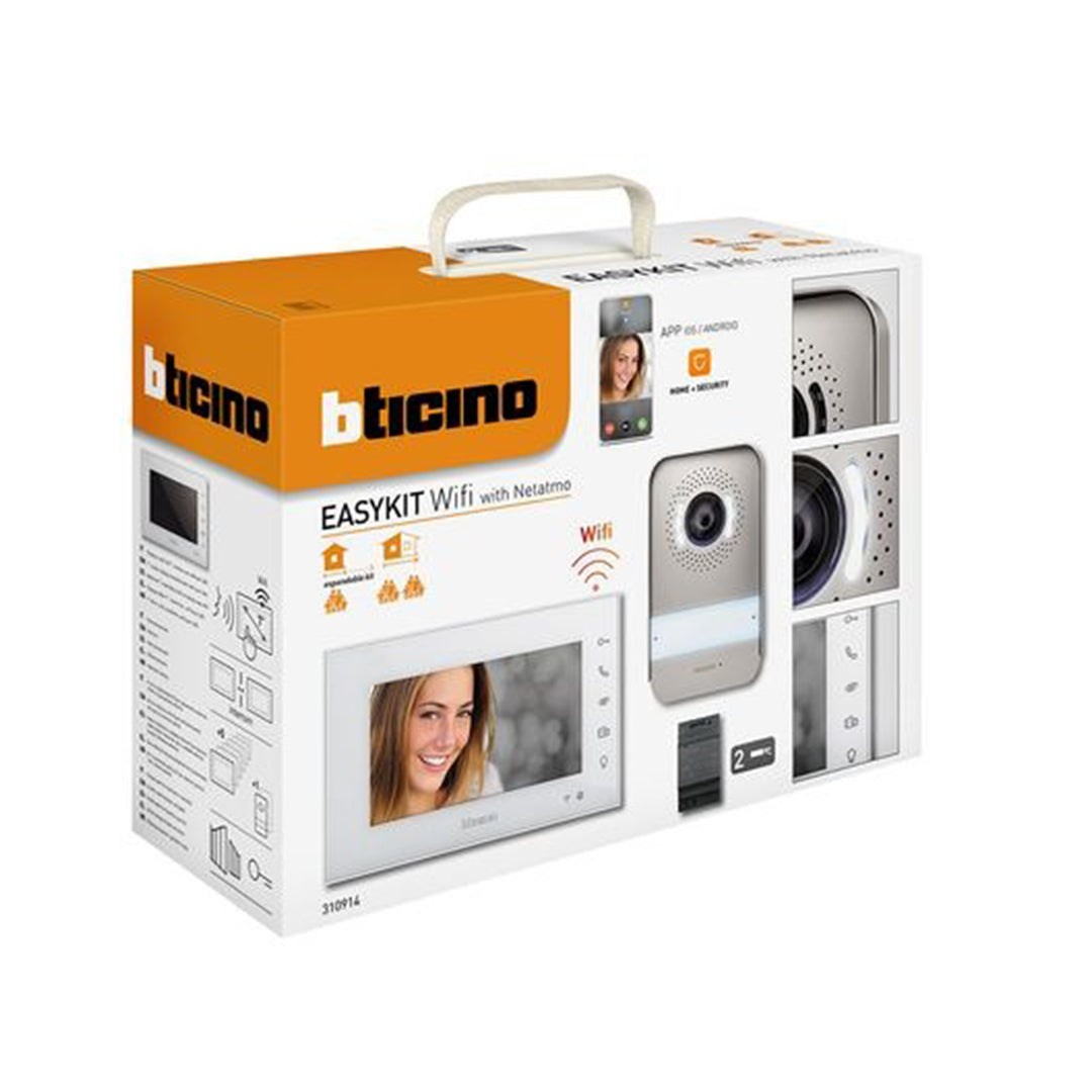 One family two wires colour EASYKIT Wifi connected video kit with DIN power supply and wall mounted entrance panel. Metal finish entrance panel with rainshield, colour wide angle camera and LED for the night illumination of the field of view. Entrance panel can be easily adapted for two family houses. An external CCTV colour camera can be directly connected to the entrance panel. Wifi connected handsfree 7î screen internal unit white finish with 2 DIN modules power supply included. The system can be expanded up to 3 traditional handsfree internal units. Thanks to the Wifi connection, you can associate the video internal unit to the Home + Security App (available for Android and iOS). You can manage by the App the main video internal unit functions (receiving calls, opening the door lock, view the cameras). Through the same App, it is also possible to manage the products of the Netatmo security range (outdoor and indoor cameras, door and window sensors, indoor siren and smoke detector). This allows you to quickly and easily create a Smart security system.