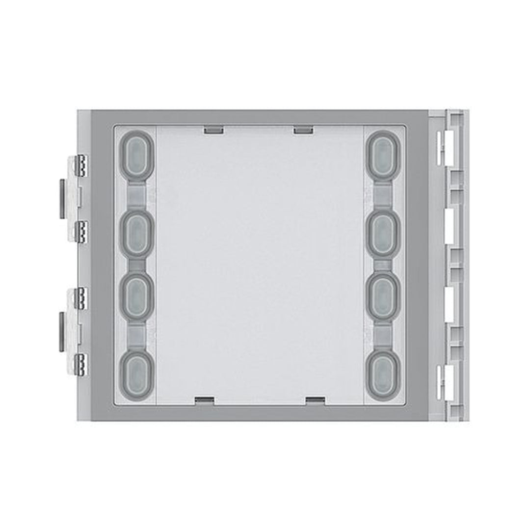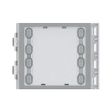 Sfera additional 8-pushbutton modules arranged on double column. To be used with speaker modules 351000 _ 351100 and audio/video modules 351200 - 351300. Connection by the multicable supplied. Backlighting of nameplates controlled by the speaker module or the audio/video module connected. To be completed with surround plate.
